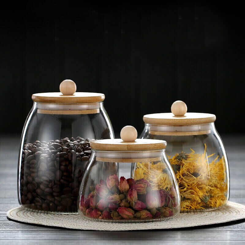 MATERIAL & QUALITY:The airtight glass jar set is made of food-grade high borosilicate glass, 100% lead-free.These cute glass containers are thicker than other jars.There is a silicone ring on the bamboo lid that will not make a sound and scratch the jar when the lid is opened.This glass storage tank can be heated to 150 degrees Celsius with an open flame or frozen to minus 20 degrees Celsius.